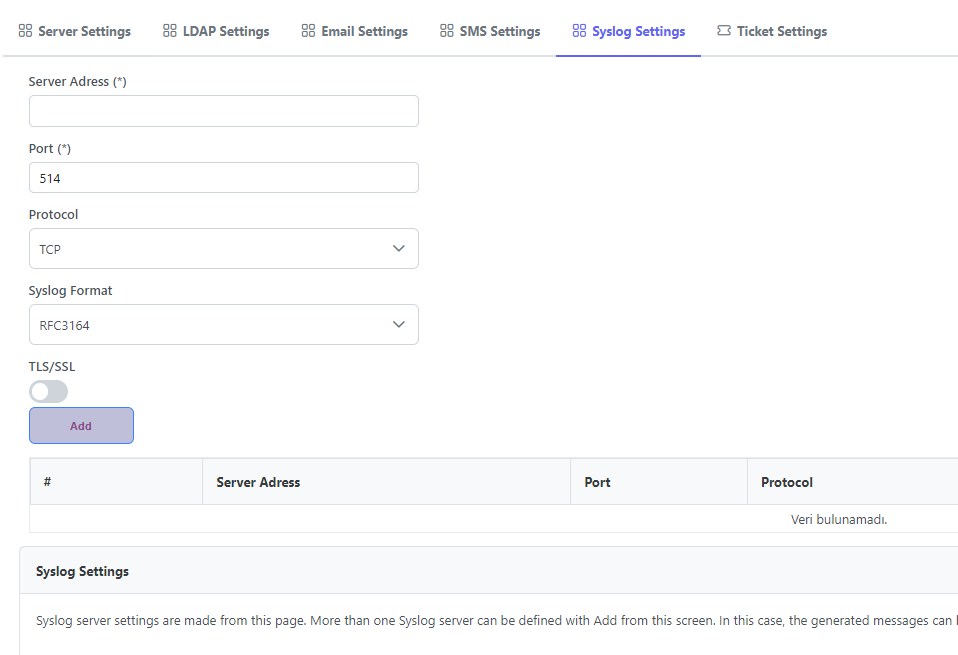 TLS is used to determine whether the secure channel will be used in syslog transactions. Although it is a port-independent setting but port information may change depending on the selection made here. The port that the syslog server listens to in order to send messages. By default, most syslog servers use UDP port 514. Secure channel and TCP port information may need to be obtained from the syslog server administrator.